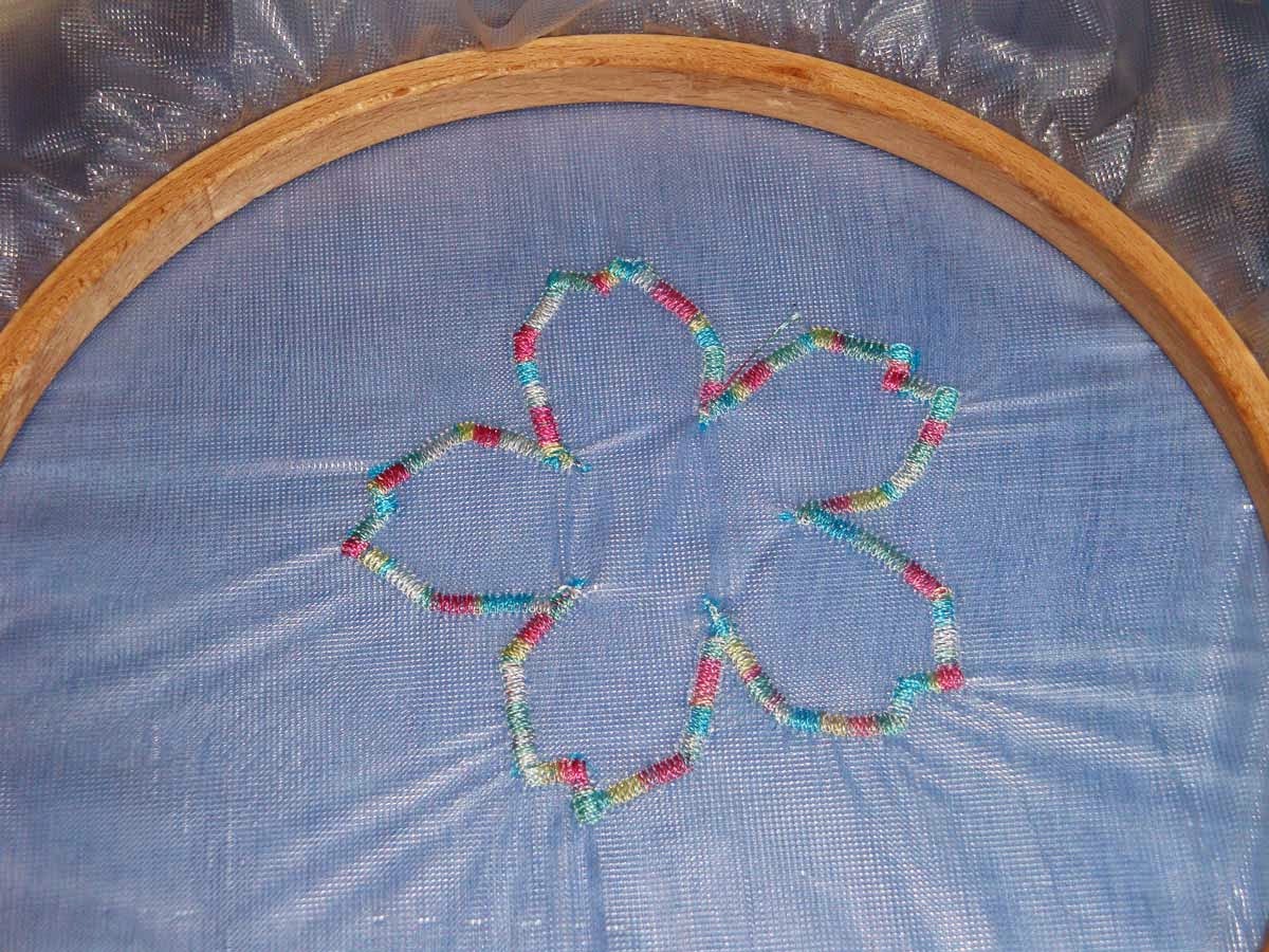 The photo shows the completed flower but it's still in the embroidery hoop. The reason for this is that the fabric and solvy (the water-soluble plasticky sheet you can see) required to make one flower is far more than required for the flower alone. This is because it requires the fabric in the hoop as well as some overhang so the hoop has something to grip on to. So saving resources is important because waste is naff, and more importantly, I'm using two layers of solvy for each flower, and it's expensive. The solvy stabilises the fine organza while it's being embroidered.